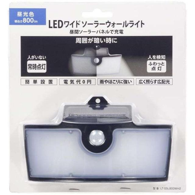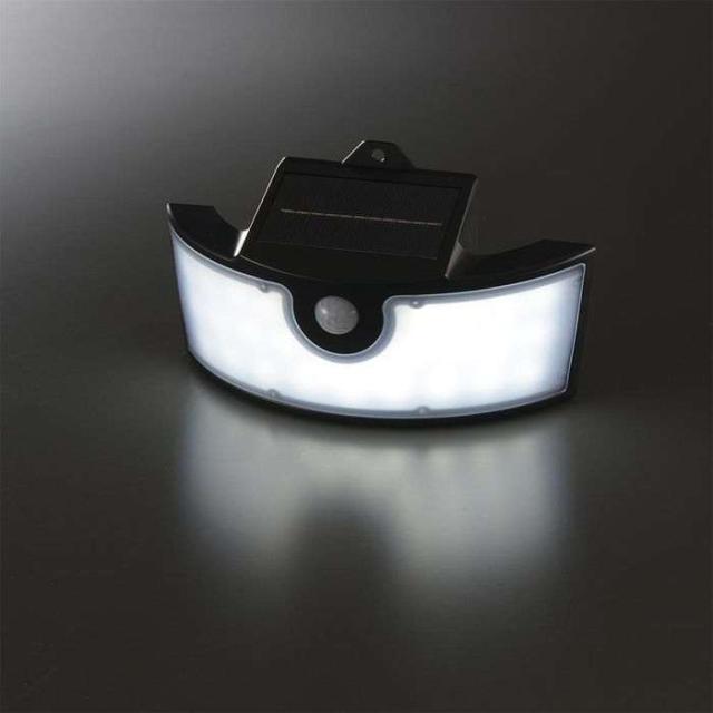 昼間はソーラーパネルで充電。暗くなると常時点灯し、人を検知すると強点灯で約10秒間点灯したあと、自動で常時点灯に切り替わります・センサーが検知しない場合、優しい明かりで周囲を照らす常時点灯モード・センサーが検知した場合、ふわっと照らす点灯モードで約10秒強点灯後、常時点灯モードに。簡単設置。電気代0円。雨やほこりに強い。広く照らす広配光。昼光色、明るさ800ルーメン。