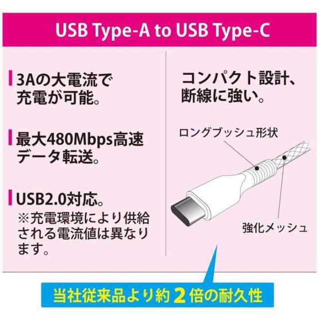 3Aの高出力で超急速充電。最大480Mbps高速データ転送。ロングブッシュ形状と強化メッシュで断線しにくい。当社従来品より約2倍の耐久性。コンパクト設計。USB2.0対応。