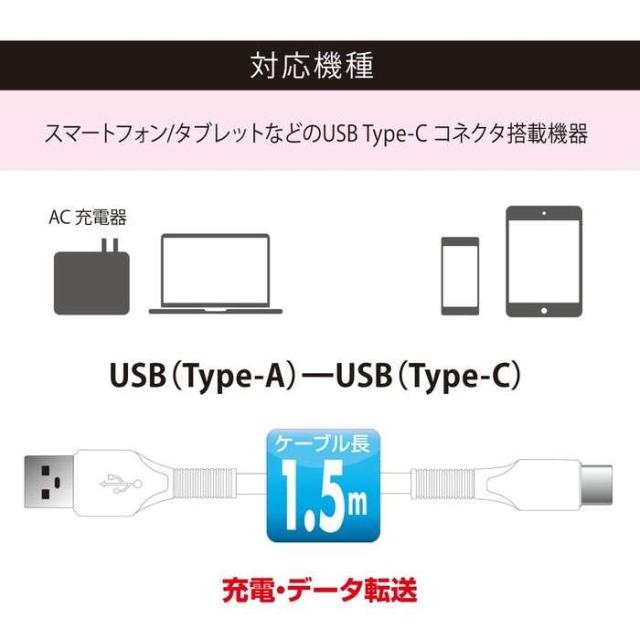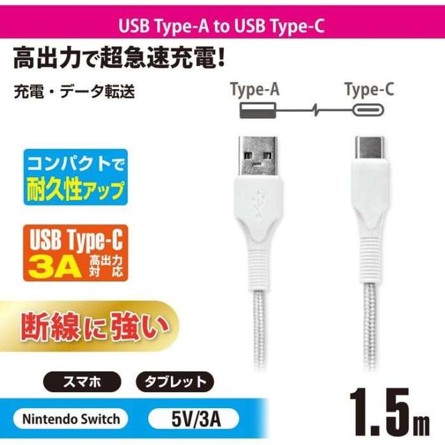 USBケーブル Type-A to Type-C 3Aの高出力 ロングブッシュ形状 強化メッシュ 1.5m ホワイト