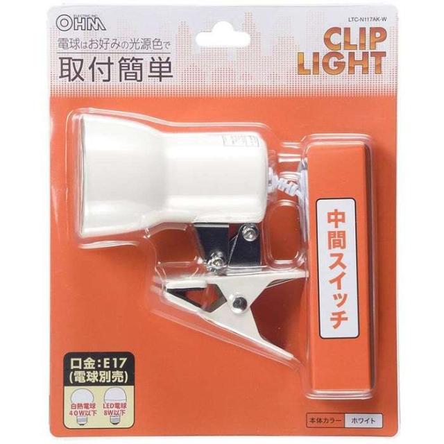 クリップライト(E17/電球別売/白熱電球40W以下、LED電球8W以下/中間スイッチ付/ホワイト) OHM LTC-N117AK-W