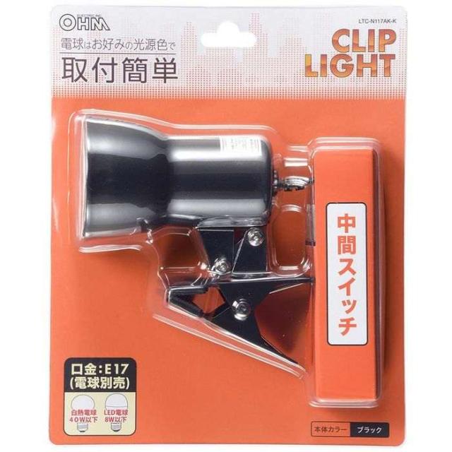 クリップライト(E17/電球別売/白熱電球40W以下、LED電球8W以下/中間スイッチ付/ブラック) OHM LTC-N117AK-K