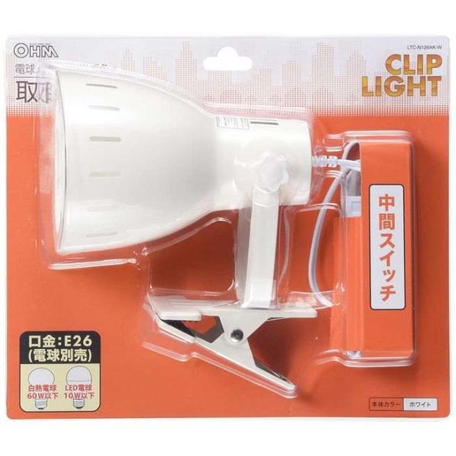 クリップライト(E26/電球別売/白熱電球60W以下、LED電球10W以下/中間スイッチ付/ホワイト) OHM LTC-N126AK-W