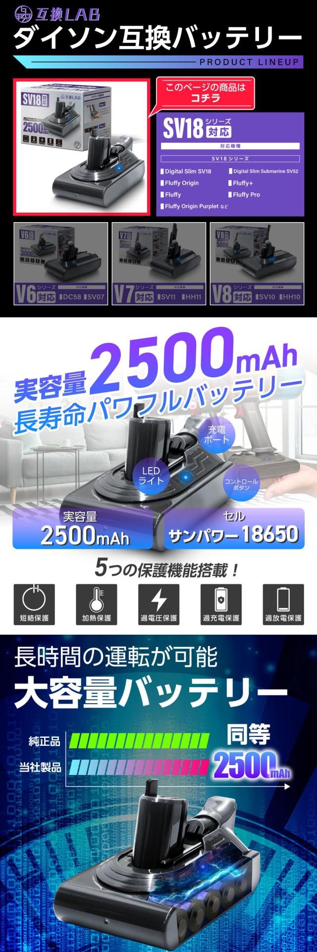 【大容量2500mAh】互換ラボ ダイソン対応 バッテリー V10Slim Detect Slim 掃除機 互換 充電池 サンパワーセル搭載 18650 Fluffy Slim Absolute PSE取得 交換 簡単 フィルター ネジ ドライバー日本語説明書付 コードレス 部品 アタッチメント ノズル パーツ ツール ハンディ
