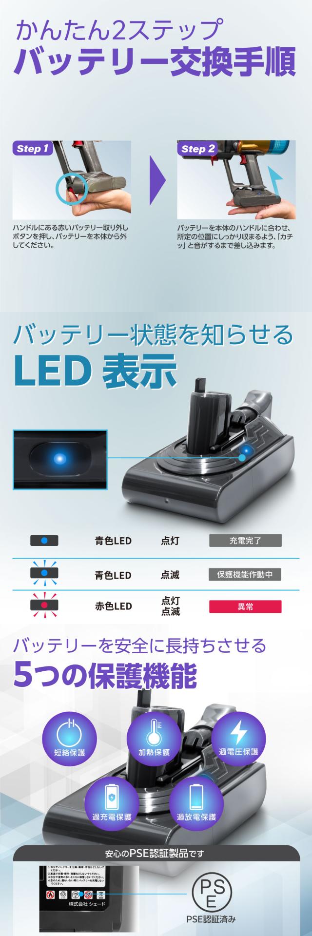 | 互換ラボのバッテリーが選ばれる理由 | 【1】PSE認証取得済み|安全性重視設計 国内法令に基づくPSE認証済みバッテリーを採用。 過電流、過電圧、過充電、ショート防止などの多重保護回路を搭載し、毎日の掃除を安全にサポートします。 【2】大容量2500mAh|長時間&長寿命 サンパワー18650セルを採用した大容量2500mAh仕様。 純正バッテリーを超えるパワフルな吸引力と持続力で、ダイソンV10Slim掃除機本来の性能を最大限に引き出します。 「すぐにバッテリー切れする…」そんな悩みを解消! 【3】幅広い対応機種|V10Slimシリーズ多数対応 下記のダイソン掃除機本体型番・サブモデルに対応しています。 Detect Slim/V10Slimシリーズ 多くのダイソンV10Slimユーザーの方にご利用いただいています。 【4】互換・交換用設計|簡単取り付け・初心者安心 純正バッテリーからの交換方法はとても簡単。 付属の日本語説明書を見ながら、ご自身で同梱のドライバーで簡単に取り付け可能です。 女性やご高齢の方、DIYが苦手な方でも安心してご利用いただけます。 【5】安心の保証&サポート 日本語サポート体制も充実。不良・トラブル時も迅速に対応いたします。 |