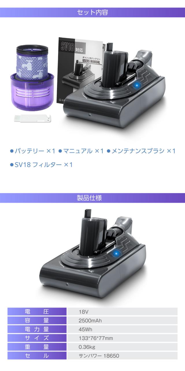 | 商品仕様 | 対応機種:ダイソンV10Slimシリーズ モデル名:Detect Slim 容量:2500mAh 電圧:21.6V 認証:PSE認証済み セル:サンパワー18650 保護機能:過充電・過放電・過電流・過熱・短絡防止 |