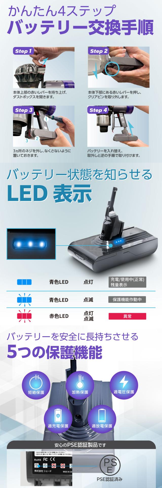 | 互換ラボのバッテリーが選ばれる理由 | 【1】PSE認証取得済み|安全性重視設計 国内法令に基づくPSE認証済みバッテリーを採用。 過電流、過電圧、過充電、ショート防止などの多重保護回路を搭載し、毎日の掃除を安全にサポートします。 【2】大容量5000mAh|長時間&長寿命 サンパワー21700セルを採用した大容量5000mAh仕様。 純正バッテリーを超えるパワフルな吸引力と持続力で、ダイソンV8掃除機本来の性能を最大限に引き出します。 「すぐにバッテリー切れする…」そんな悩みを解消! 【3】幅広い対応機種|V8シリーズ多数対応 下記のダイソン掃除機本体型番・サブモデルに対応しています。 SV10/V8シリーズ また、「Absolute」「Animal」「Fluffy」「Extra」「Mattress」「Slim」「Pro」など各サブネームにも対応。 多くのダイソンV8ユーザーの方にご利用いただいています。 【4】互換・交換用設計|簡単取り付け・初心者安心 純正バッテリーからの交換方法はとても簡単。 付属の日本語説明書を見ながら、ご自身で同梱のドライバーで簡単に取り付け可能です。 女性やご高齢の方、DIYが苦手な方でも安心してご利用いただけます。 【5】安心の保証&サポート 日本語サポート体制も充実。不良・トラブル時も迅速に対応いたします。 |