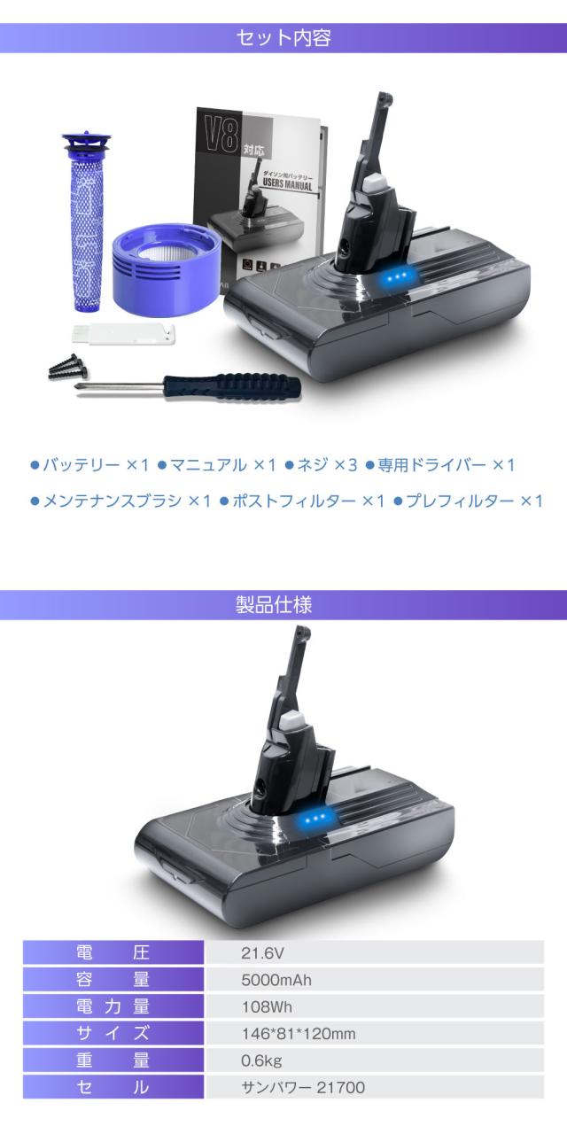 【大容量5000mAh】互換ラボ ダイソン対応 バッテリー V8 SV10 掃除機 互換 充電池 サンパワーセル搭載 21700 Fluffy Slim Absolute PSE取得 交換 簡単 フィルター ネジ ドライバー日本語説明書付 コードレス 部品 アタッチメント ノズル パーツ ツール ハンディ