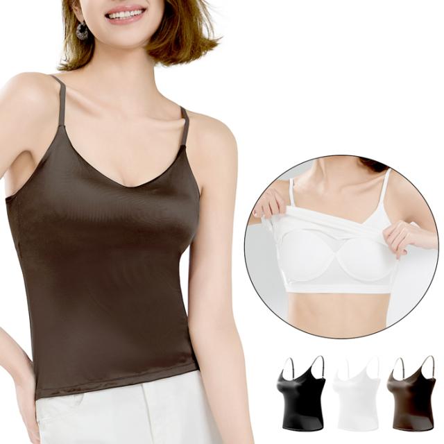 カップ付きキャミソール ブラトップ レディース サテン 光沢 艶 キャミソール インナー エレガント 上品 シンプル 軽やか 楽ちん 肩紐調節 黒 白 茶 rr-045