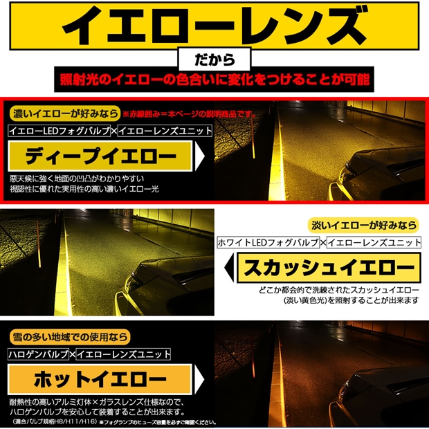 イエローレンズにLEDイエロー光を通すのでフォグの照射光は「濃いイエロー光=DEEP YELLOW」になります。イエローレンズなので非点灯時も抜群のアピール性を発揮します。