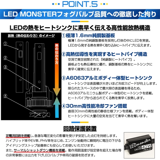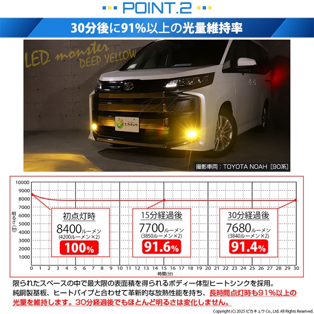明るさ全光束8400ルーメンの最強のモンスターフォグランプLEDバルブです。放熱性能が高いため、長時間点灯後も91%以上の光量を維持します。30分経過後もほとんど明るさが変化しない放熱対策を施しています。純正球の配光特性に徹底的にこだわり、理想的な配光を実現しています。