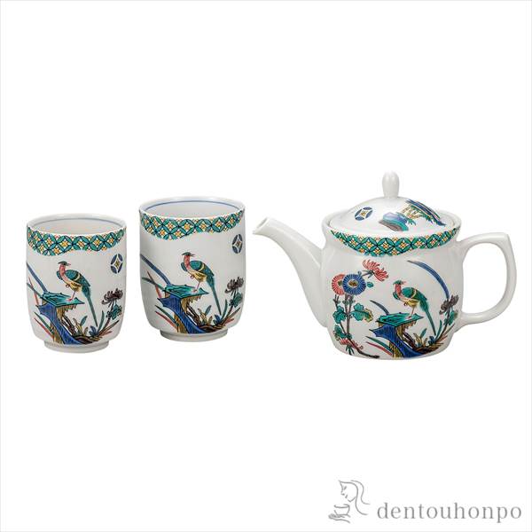 「送料無料」 くつろぎ揃 古九谷花鳥 茶こし網付 ( 退職祝い 定年 湯のみ 急須 ポット プレゼント 日本茶 九谷焼 結婚 出産 内祝い )