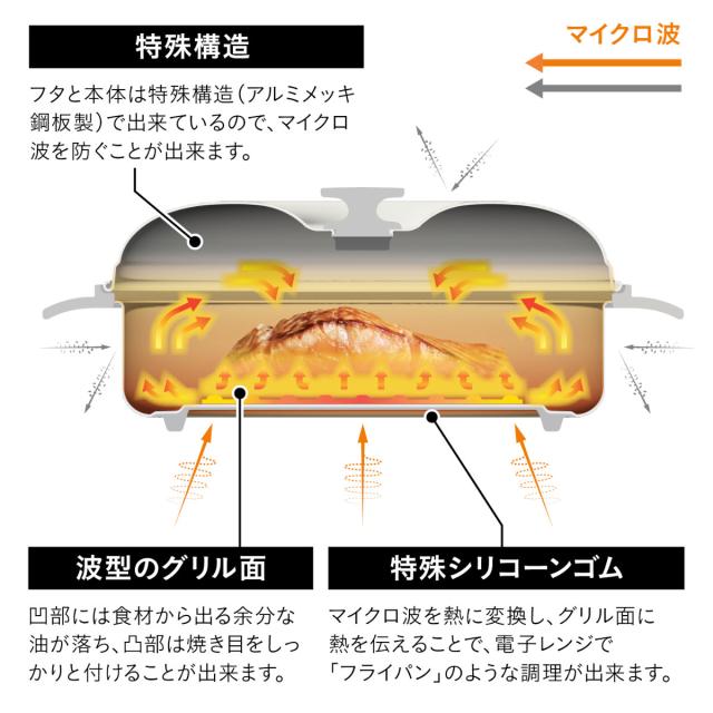 特殊なシリコーンゴムがマイクロ波を熱に変えグリル面に熱を伝えることで、焼き目をしっかり付けることができます。