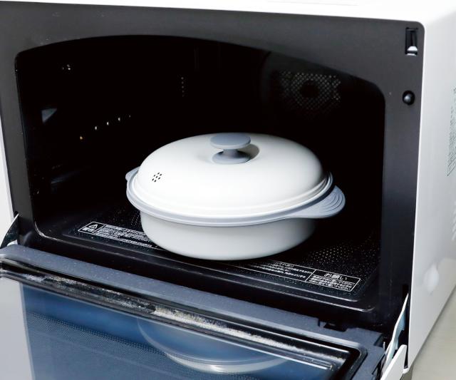 本体の底面に水を少し垂らし、蒸し皿をセットして食材を敷き詰めて電子レンジで温めるだけで、いつものメニューが簡単にヘルシーな蒸し調理へ変身。