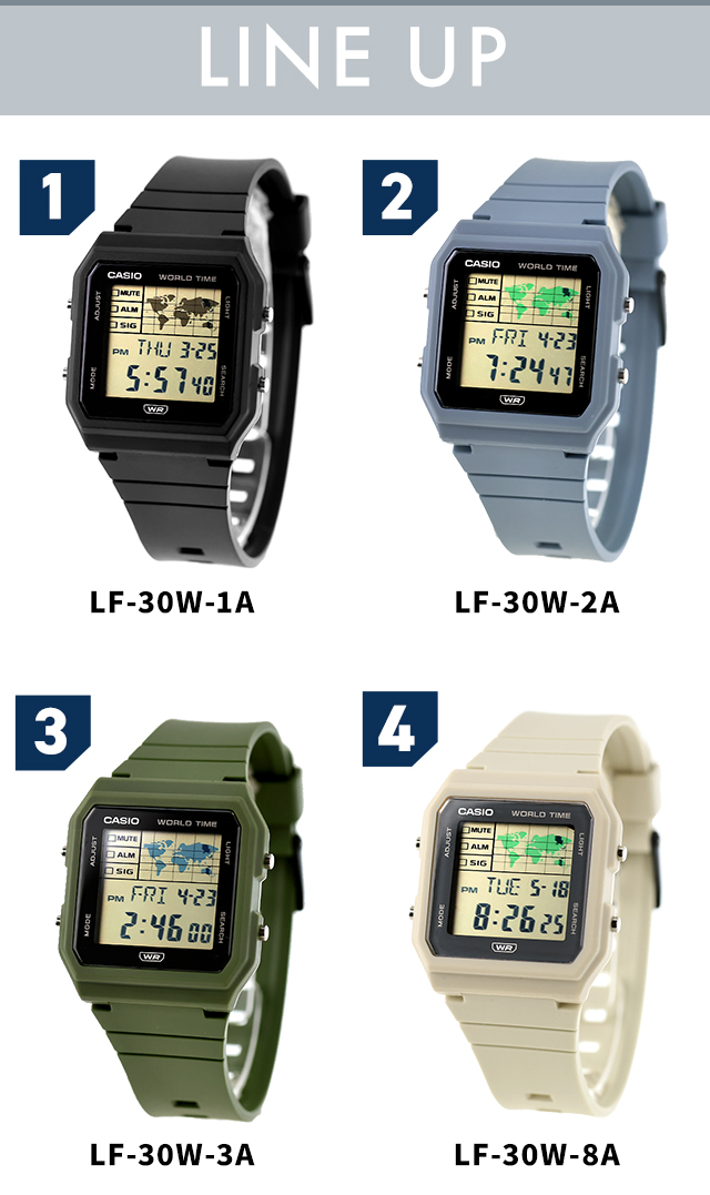 7年保証キャンペーン カシオ チープカシオ CASIO クラシック クォーツ 電池式 クォーツ 電池式 ユニセックス 腕時計 LF-30W CLASSIC デジタル ブラック グレー 選べるモデル ◆世界地図を時計にデザインしたユニークなモデルです。現在表示しているタイムゾーンの場所を、右上の世界地図にマッピング。飽きのこないベーシックカラーを採用したユニセックスサイズです。バンドの樹脂パーツには、環境負荷低減への貢献が期待されるバイオマスプラスチックを使用しています。LEDバックライト、ストップウオッチ、時刻アラーム、タイマー、ワールドタイム等便利な機能も備えています。誕生日や記念日のプレゼントにもおすすめです。 LF-30W-1ADF LF-30W-2ADF LF-30W-3ADF LF-30W-8ADF