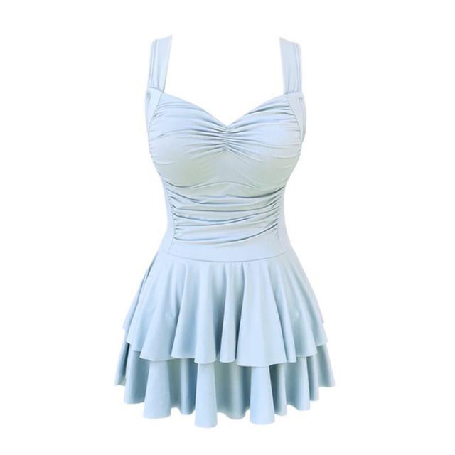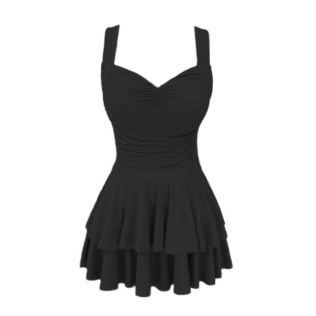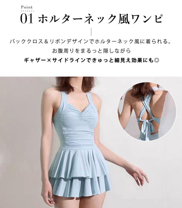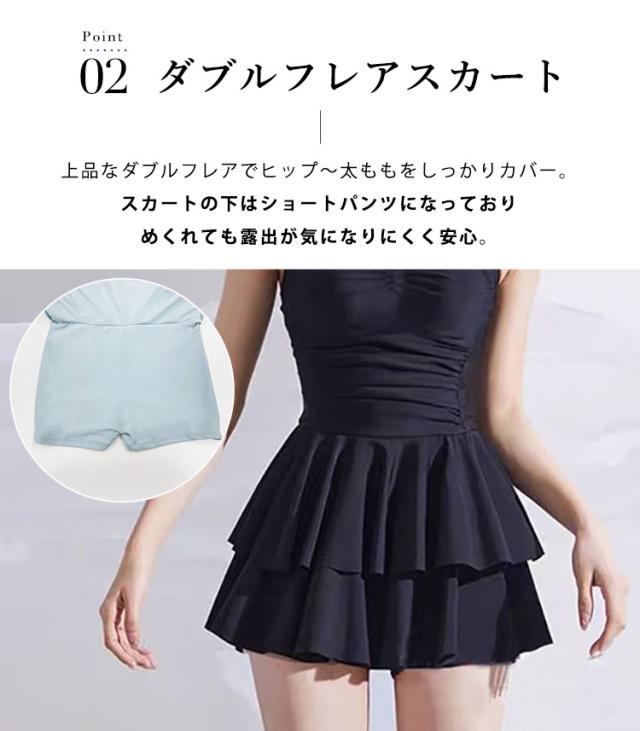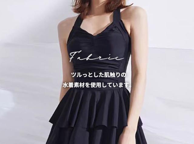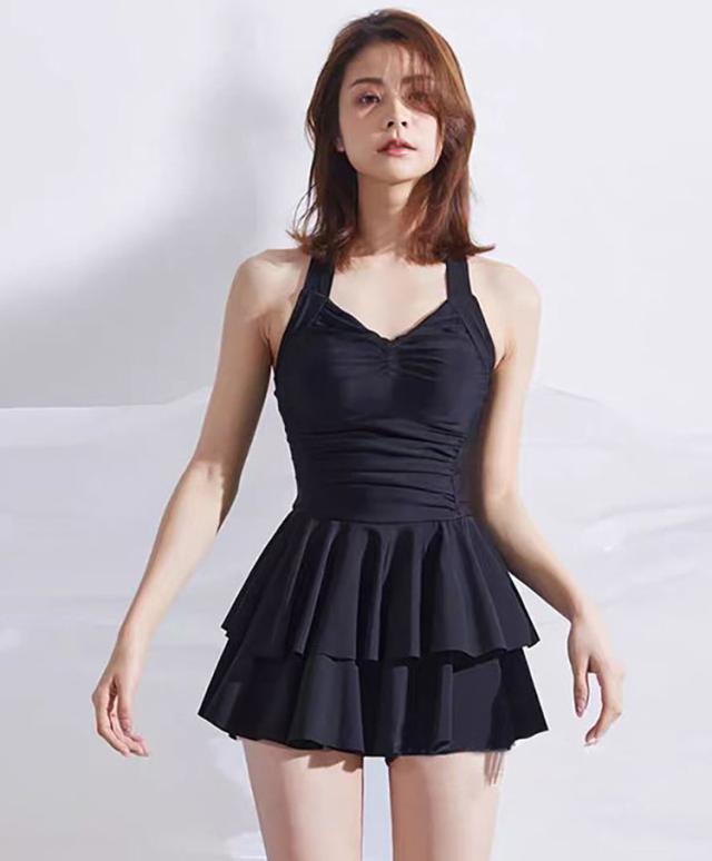 夏新作 水着 ワンピース 体型カバー レディース 胸パッド付き オールインワン ノースリーブ ティアード フレア Aライン ギャザー バッククロス 肩紐 アンダー一体型 ノンワイヤー バスト 盛れる ウエスト ヒップ 太もも カバーアップ 無地 黒