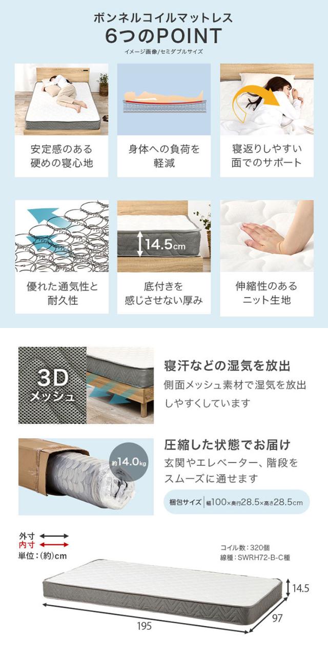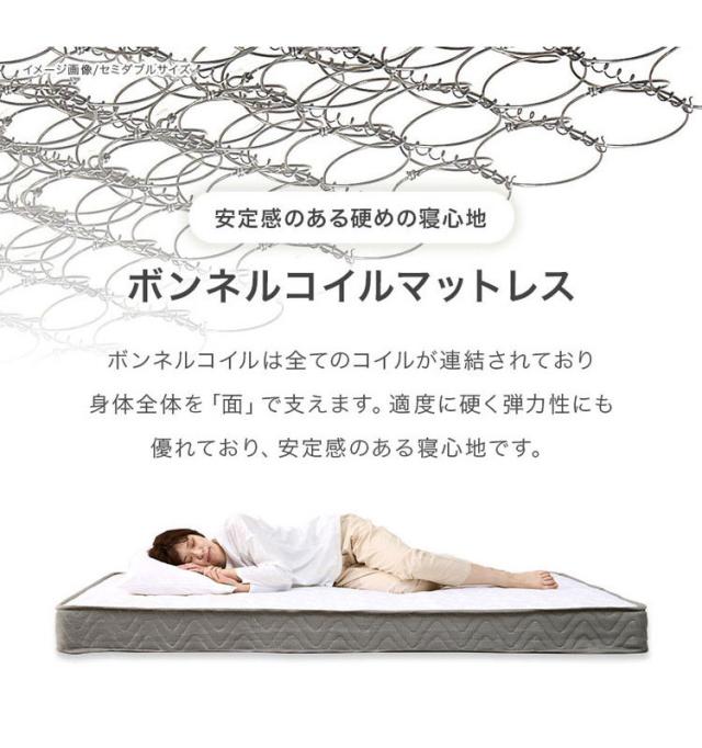 ベッドフレーム:天然木(パイン)、マットレス張地:ポリエステル、マットレス中材:ボンネルコイル使用