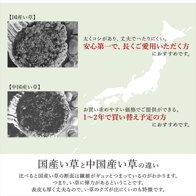 ■い草は九州産のみを使用。日本の風土で育った安心の草です。1本1本が太く、表皮が厚く繊維がキメ細かいので弾力性があり、耐久性に優れています。