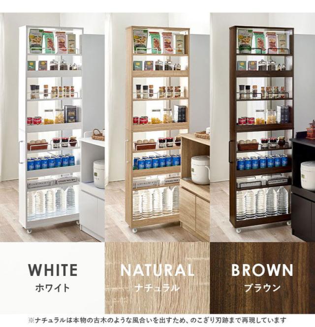 わずかな隙間に収まるスリムなワゴンラック。オープンタイプなので必要な時に取り出しやすく、背が高いので調味料やスパイスなど大量収納可能です。