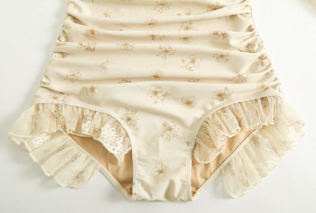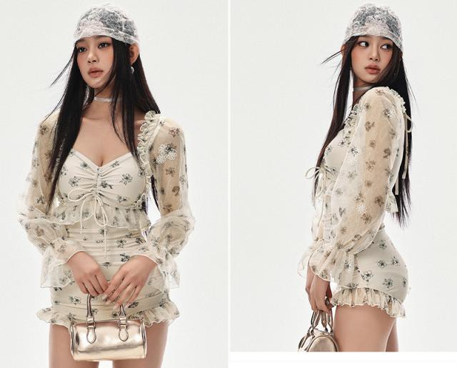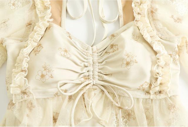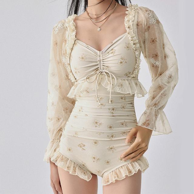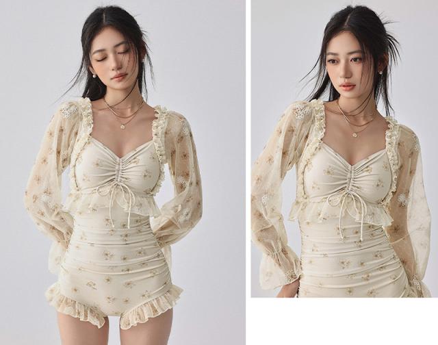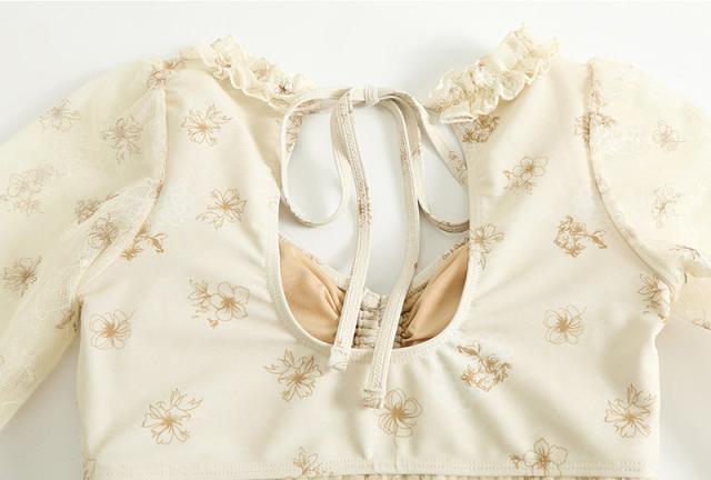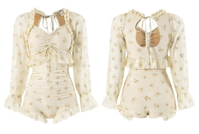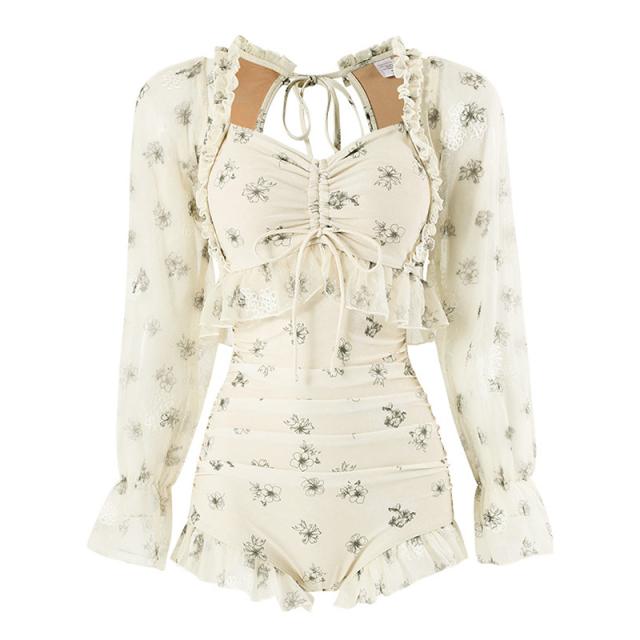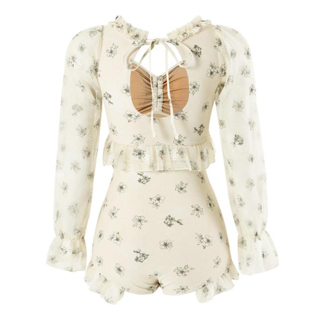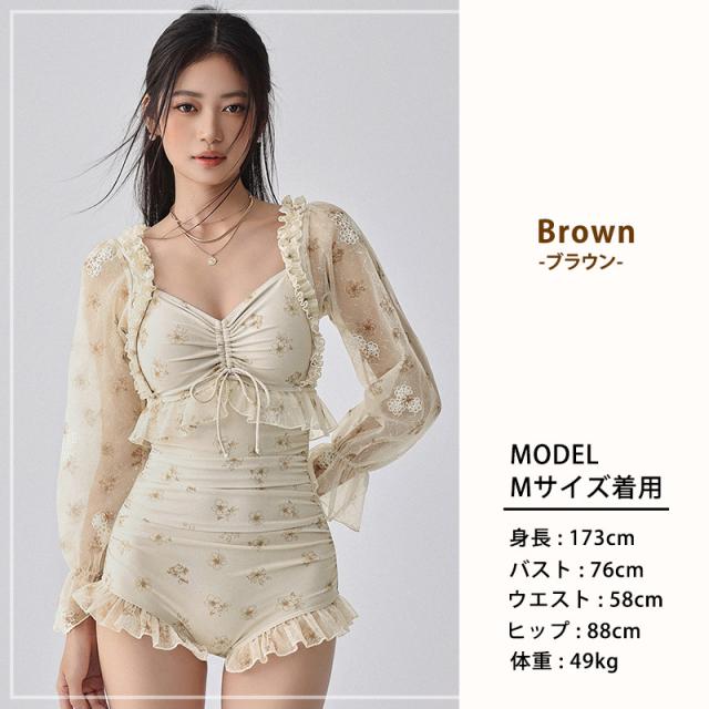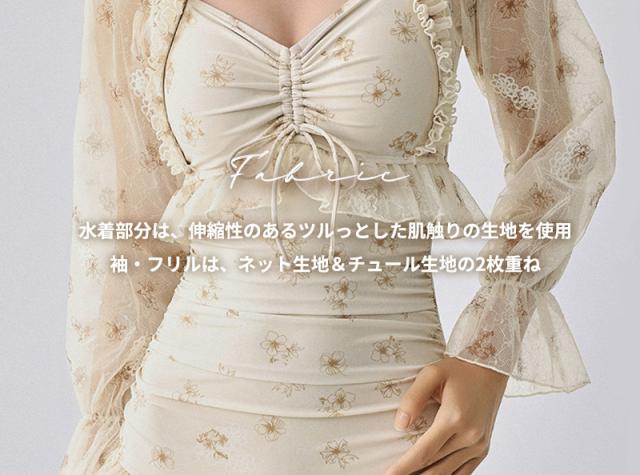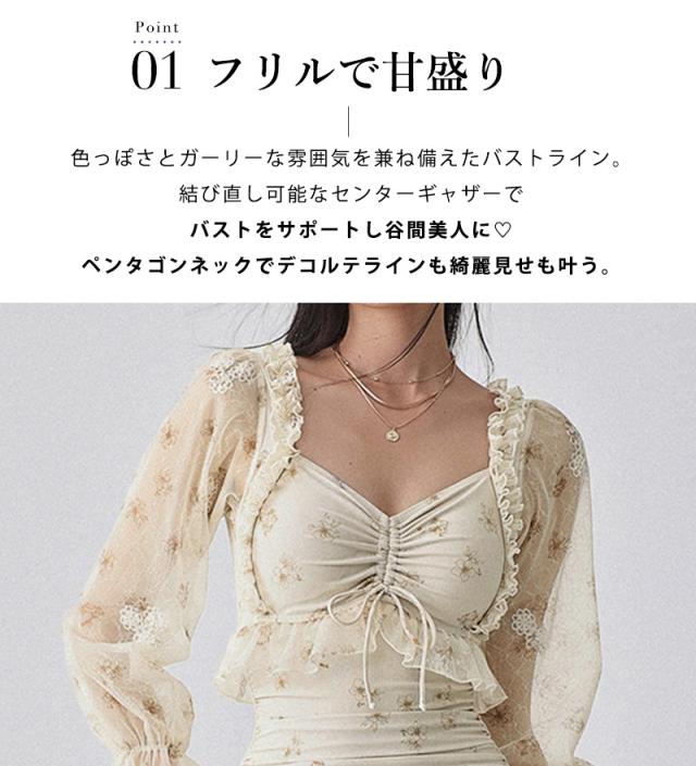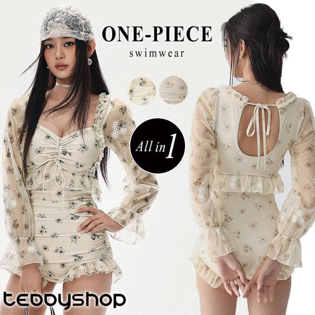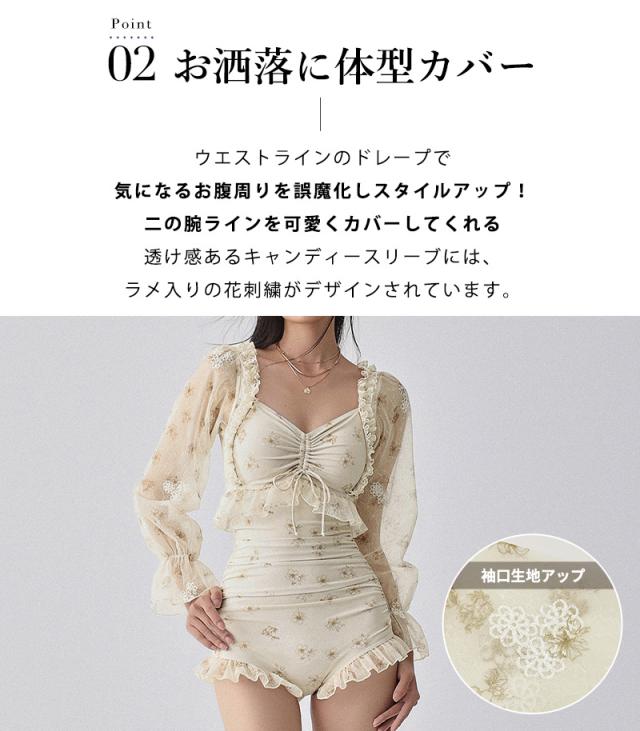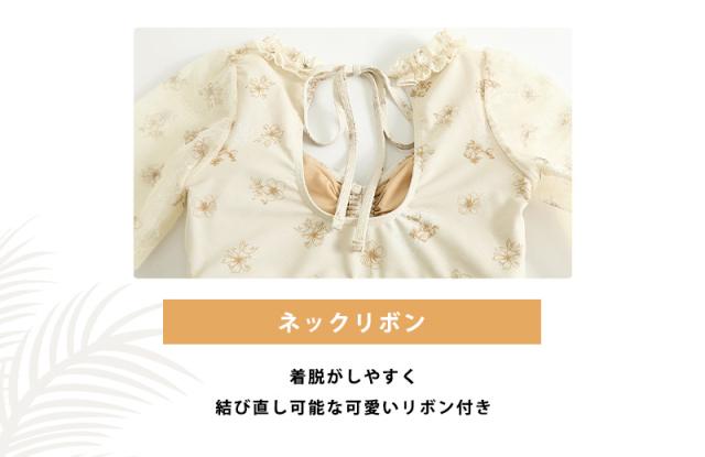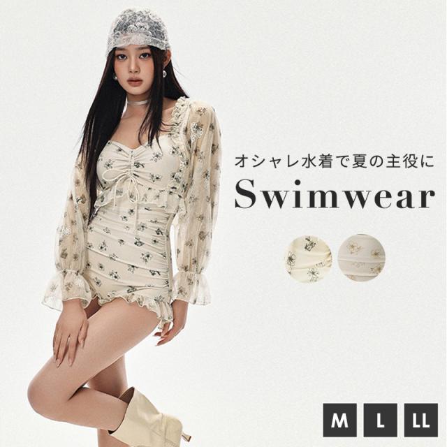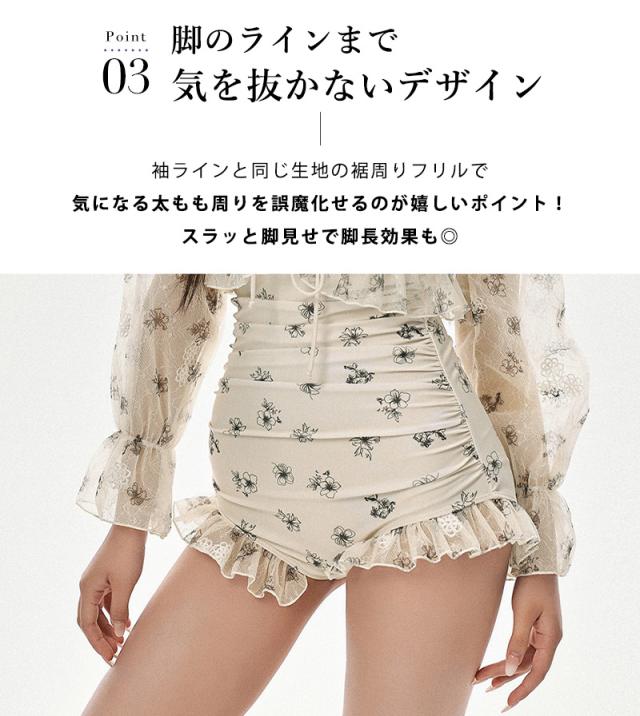夏新作 水着 ワンピース 体型カバー レディース 胸パッド付き オールインワン シアー キャンディスリーブ 長袖 フリル ペンタゴンネック ギャザー バックリボン ノンワイヤー バスト 盛れる 二の腕 ウエスト ヒップ 太もも カバーアップ 花柄 黒