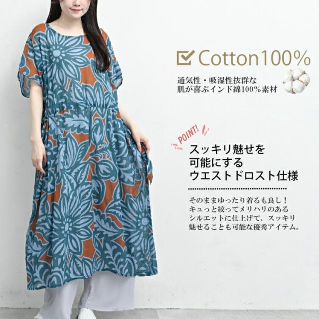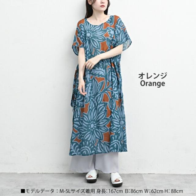 【メール便対応】キュっと絞れるドロスト仕様の大花柄エスニックワンピース。 大きいサイズ レディース ロングワンピース ロング丈ワンピース エスニックワンピース コットンワンピース リゾートワンピース エスニック柄 大花柄 大柄 総柄プリント フローラルプリント フラワーモチーフ ロング丈 アンクル丈 5分袖 ハーフスリーブ サイドドロスト ウエストシェイプ 春服 夏服 春物 夏物 春ワンピース 夏ワンピース 春ワンピ 夏ワンピ ドレス cotton100 インド綿 ゆったり ラクラク 体型カバー 大人 カジュアル ナチュラル フェミニン 旅行 華やか きれいめ かわいい かっこいい 着こなし おしゃれ 定番 春コーデ 夏コーデ ファッション 大きめ 女性 婦人用 ミセス 30代 40代 50代 2025 夏新作 春 夏 橙色 紫 茶色 M L LL 3L 4L 5L 9号 11号 13号 15号 17号 19号 hb-ss-op2704