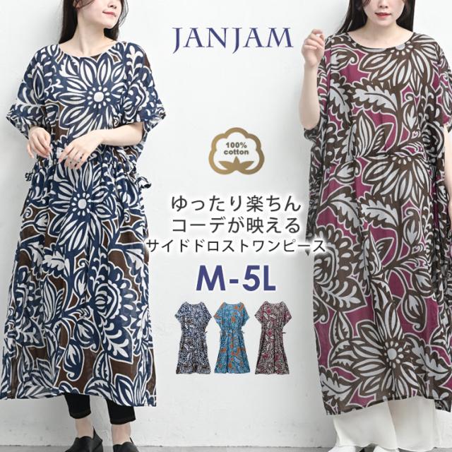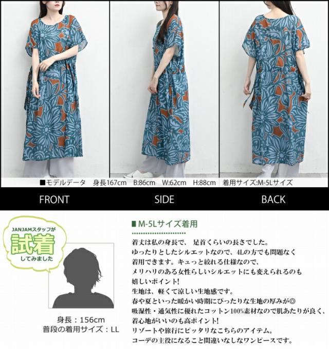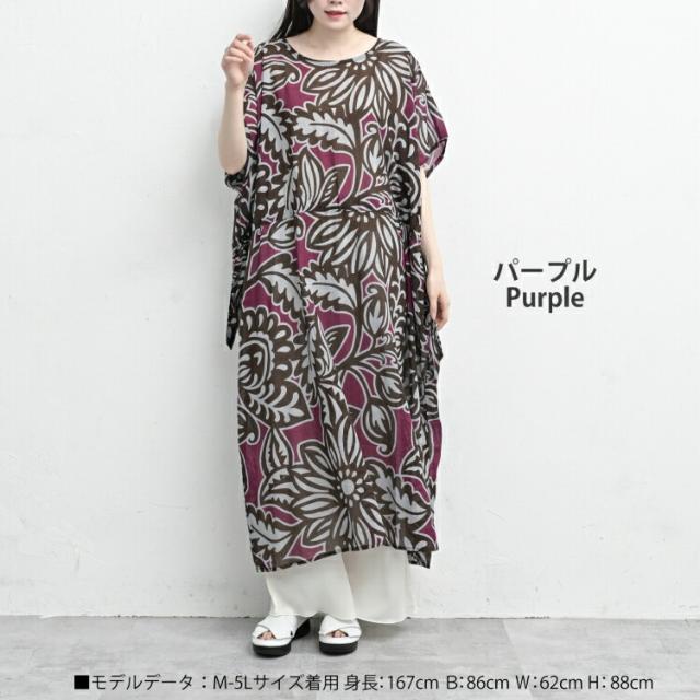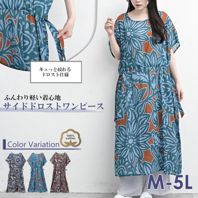 大きいサイズ レディース サイドドロストワンピース メール便対応 ロング丈 大花柄 ボタニカル柄 5分袖 エスニック cotton100 sheer M-5L ゆったりサイズ ぽっちゃり女子 プラスサイズ