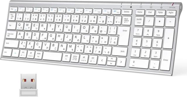 【2.4Gワイヤレスキーボード&日本語JIS配列】2.4GHzワイヤレステクノロジーにより、近周波数の電波が多く存在する環境でも、遅延やデータ欠落、干渉のない、安定した通信で快適に操作出来ます。更に最大10mの動作距離を実現し、レシーバー式で、USBポートにレシーバーを差すだけで簡単に使えます。JIS規格準拠日本語配列を採用し、スムーズなタイピングを行うことが可能です。