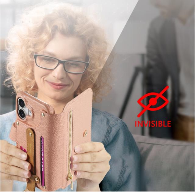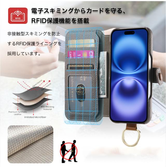 カードポケットや小銭入れとして使えるファスナーポケット付き、電子スキミングからカードを守る、RFID保護機能を搭載したウォレットケースです。