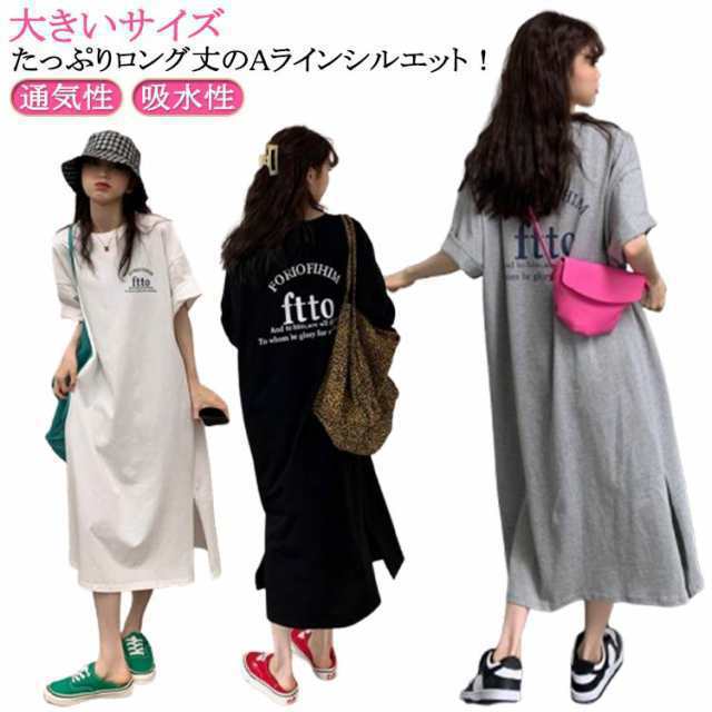 レディース 春 かわいい 大人カジュアル 大きいサイズ プルオーバー サイドスリット Tシャツワンピ ゆるワンピ 夏 Tシャツ 大きめ ロングワンピ ルームウェア リラックスワンピース ロング丈 半袖 体型カバー ゆったり 部屋着 プリント 英字ロゴ 楽ちん