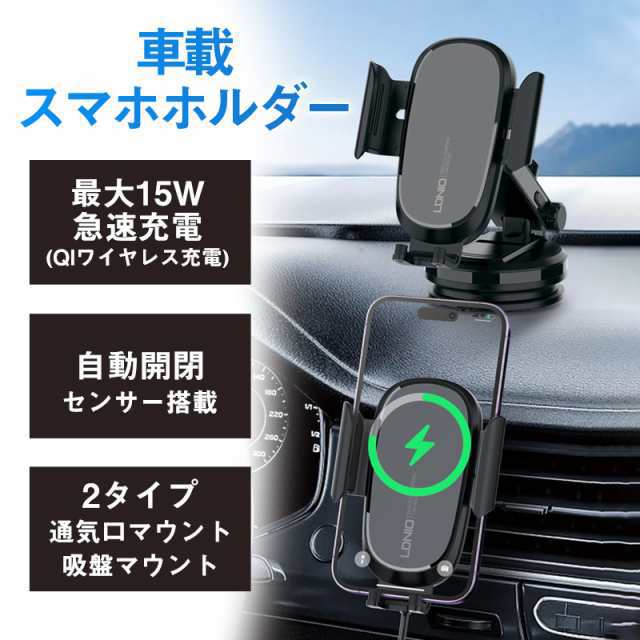 スマホホルダー 車 車載ホルダー 急速充電 QI スマホ ワイヤレス 自動開閉 携帯 スマホスタンド 吸盤 置くだけ 伸縮 固定
