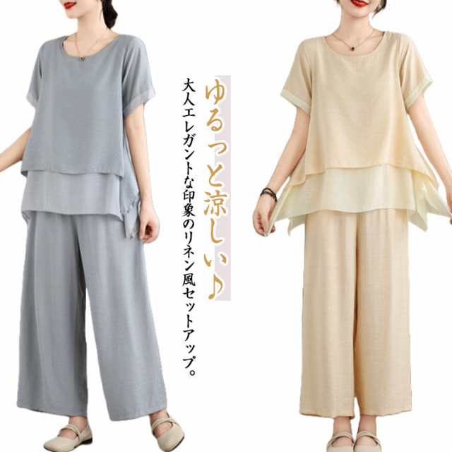 ママスーツ ママコーデ 40代 綿麻風 フレア パンツスーツ パンツドレス 30代 アシンメトリー チュニック シャツ ママコーデ ガウチョパンツ 上下セット 半袖 ブラウス ワイドパンツ 涼しい 夏