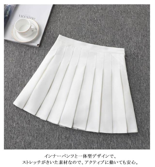 | インナーパンツ付き プリーツスカート。フィットネスやダンス、テニスなどスポーツシーンで活躍する、インナーパンツ付きのスポーツウェア。 インナーパンツと一体型デザインで、ストレッチがきいた素材なので、アクティブに動いても安心。 ウエスト中央部分に、さりげなく見えるおしゃれなトリコロールカラーのタグ付き。 どんなトップスとも合わせやすいシンプルなデザイン♪洗い替え用に色違いで揃えるのもおすすめ。 オールシーズン使用でき、様々なスポーツに活躍! | |