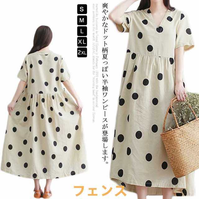 リネンVネックワンピース 綿麻 ドット柄 水玉 体型カバー リネンワンピ 半袖 ゆったり きれいめ 切り替え フェミニン レディース 女性 楽チン ポケット付き 春 夏 服 大きいサイズ 体型カバー