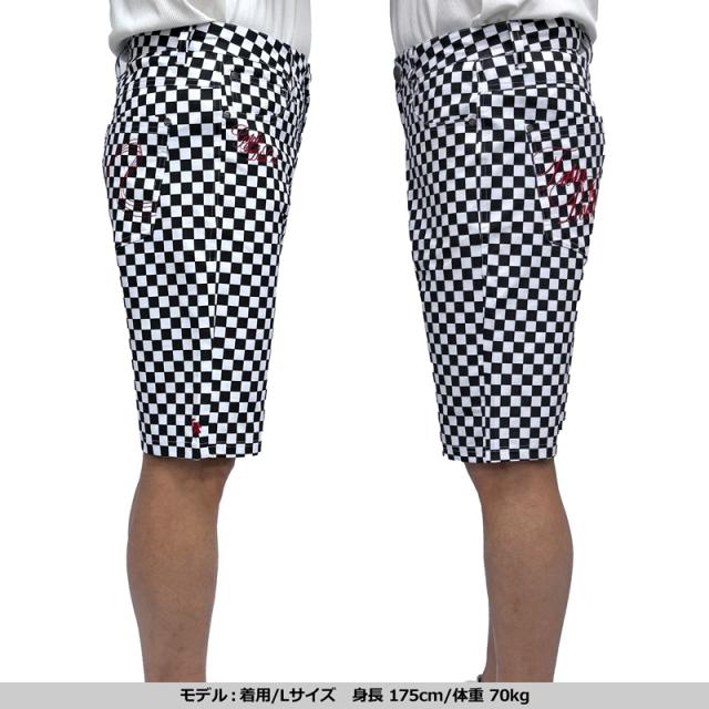 キーワード: ホワイト ブラック グレー レッド 白 黒 灰 赤 チェッカーフラグ ショーツ ショーパン ハーフパンツ 半ズボン シンプル 無地 伸縮 ロゴ 刺繍 総柄 ウエア ゴルフウェア メンズウェア ゴルフパンツ メンズパンツ ボトムス 男性用 春 夏 秋