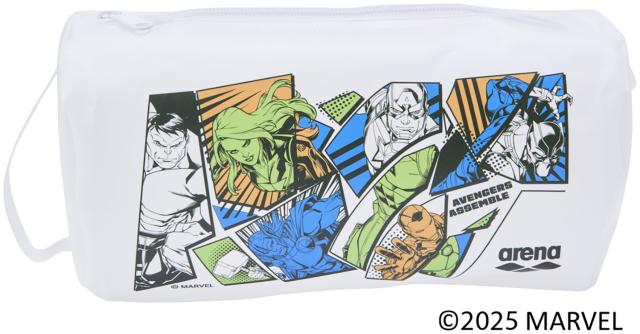 MARVEL(マーベル)デザインのプルーフバッグ。1つ持っているとスイマーに便利なラウンド型。プールで泳いだあとに濡れた水着やキャップ、セームタオルなどを収納するのに便利。また、バッグインバッグがしやすいサイズのため、トレーニングに行くときのスイミング用品の収納におすすめ。中が見えにくいホワイトカラー。アイアンマン/ソー/ブラック・ウィドウ/キャプテン・アメリカ/ハルク/ブラックパンサーと、MARVEL(マーベル)を代表するヒーローたちがアメリカンコミック調に表現され、多色使いのインクでプリント。