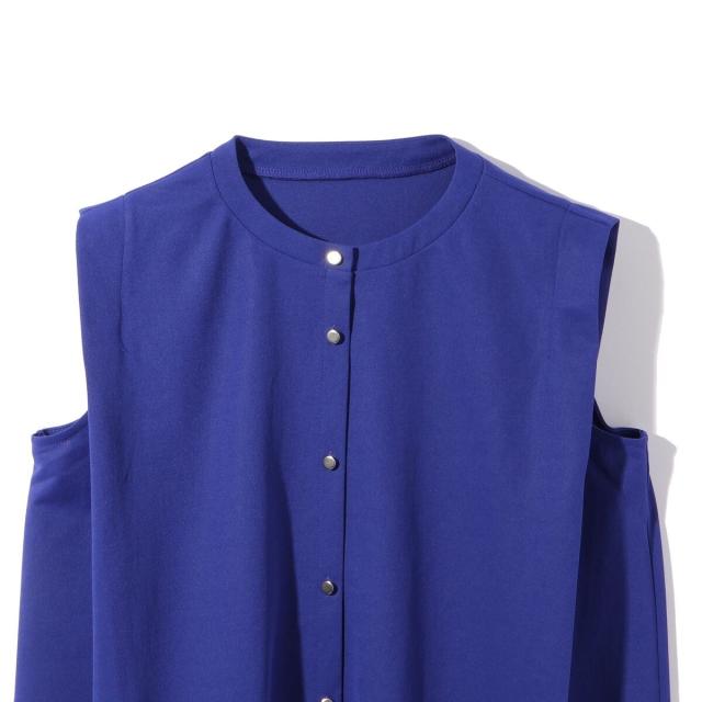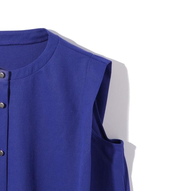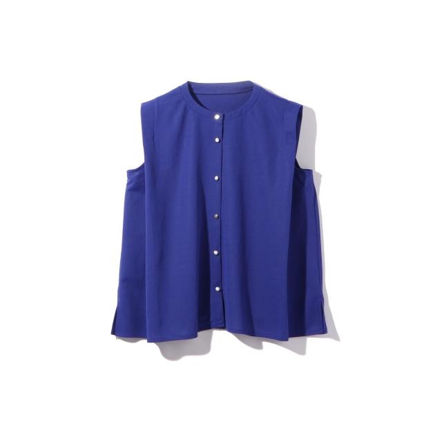 スポーツウエアなどにも採用されるカノコ素材は、カジュアルな印象に傾きがちなので、メタルボタンを採用しブラウスライクに仕上げました。