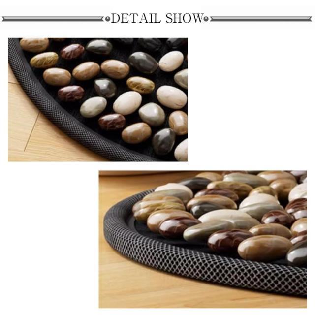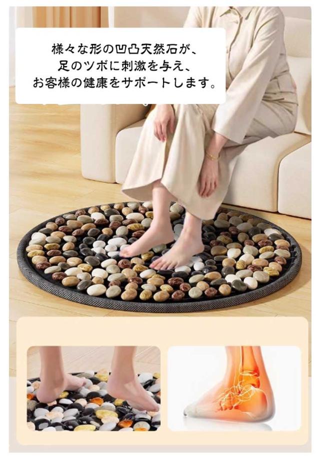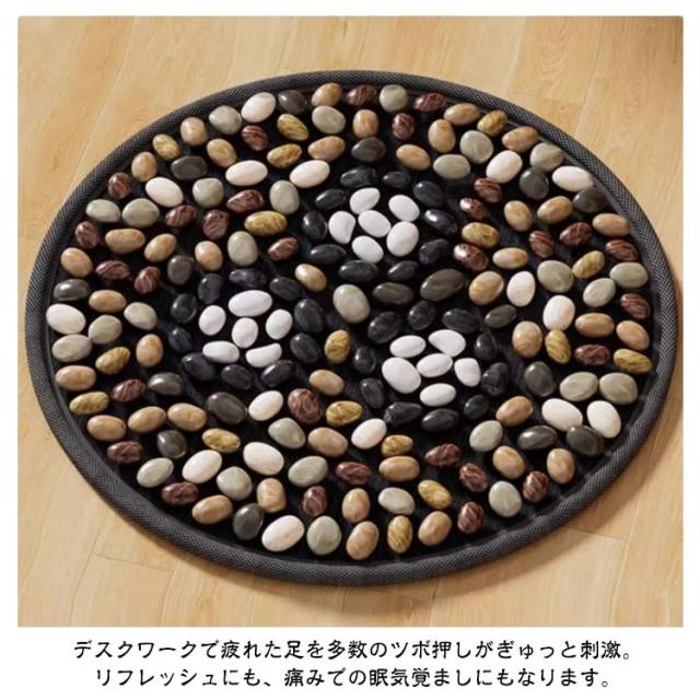 | 様々な形の凹凸天然石が、足のツボに刺激を与える足つぼマッサージマット。【直径40cm】 仕事中でも、こっそりリフレッシュ。仕事で忙しく、疲れた身体のケアの時間も取れない人に向けた、オフィスでも、お家でも、仕事をしながらでも、もちろんリラックスタイムにも、いつでもどこでも使いやすいヘルスケアグッズです。 様々な形の凹凸天然石が、足のツボに刺激を与え、お客様の健康をサポートします。 デスクの下でツボ押しができ、リフレッシュできる、足つぼマットです。 デスクワークで疲れた足を多数のツボ押しがぎゅっと刺激。リフレッシュにも、痛みでの眠気覚ましにもなります。 石がしっかり粘られていて、落ちる心配はいられないです。また、底に採用した材質は摩損しにくく、長く使用できます。 | |