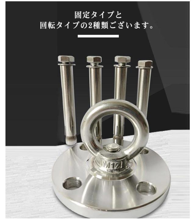 | 天井吊り下げ用の天井フックです。 固定タイプと回転タイプの2種類ございます。 ステンレス製のため錆びることなく屋内だけじゃなく屋外でも使用可能。 エアリアルヨガ ハンモック ハンキングチェア サンドバッグ、 サスペンショントレーナーなど用途に向いております。 | |