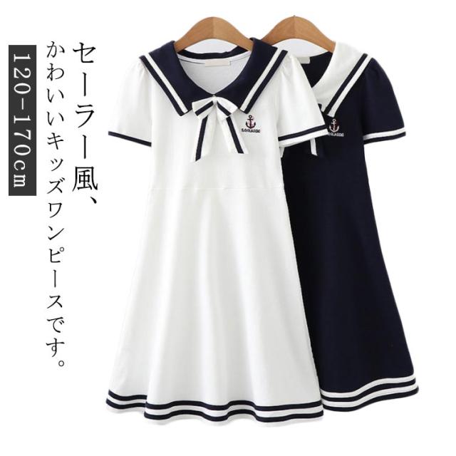 女の子 お出かけ 半袖 ジュニア セーラー風 150cm 子供 ワンピース キッズ 子どもワンピース ライン入り 姉妹 お揃い かわいい おしゃれ シンプル 韓国子供服 120cm 130cm 140cm セーラー風 160cm