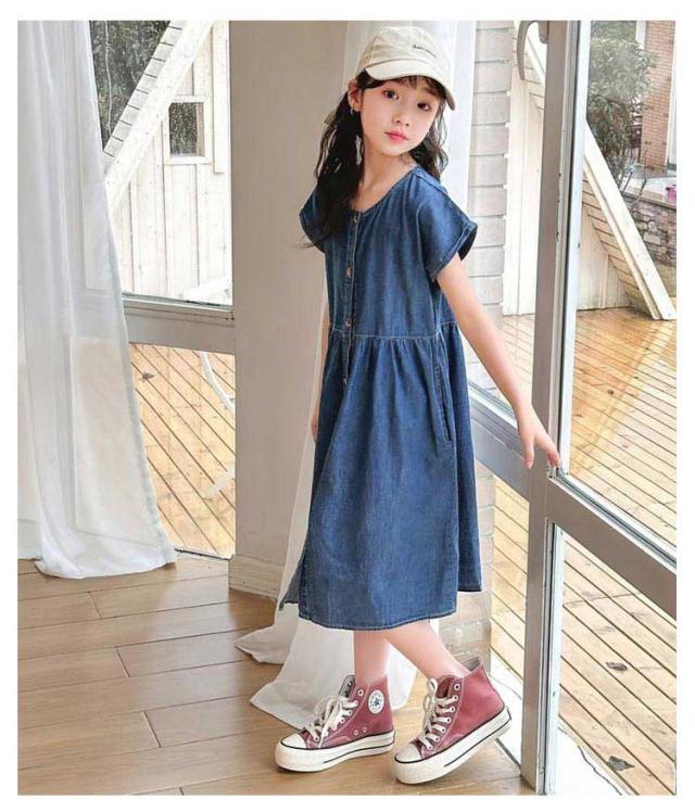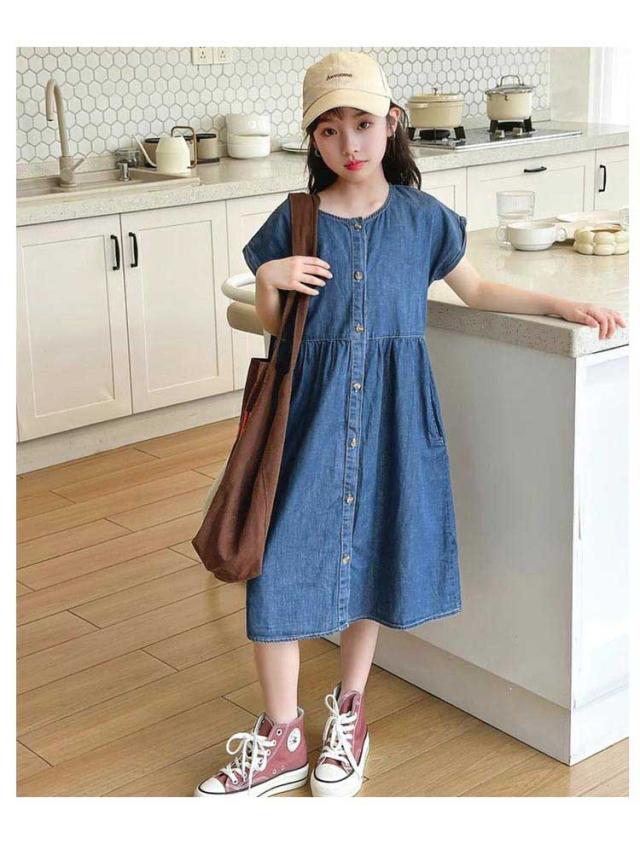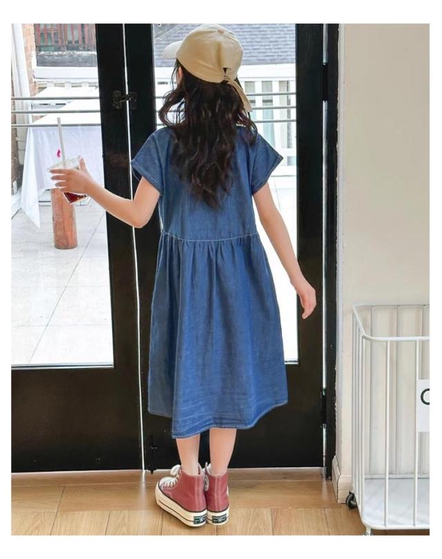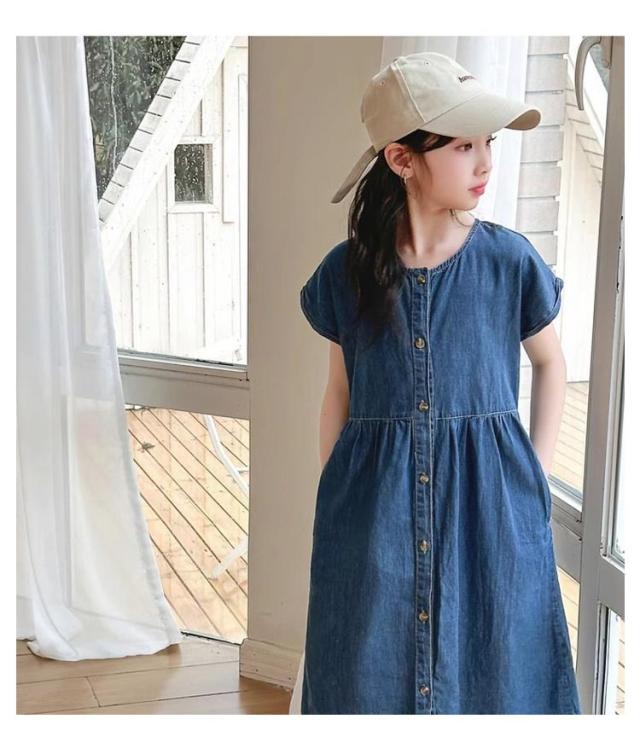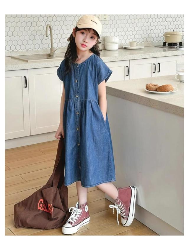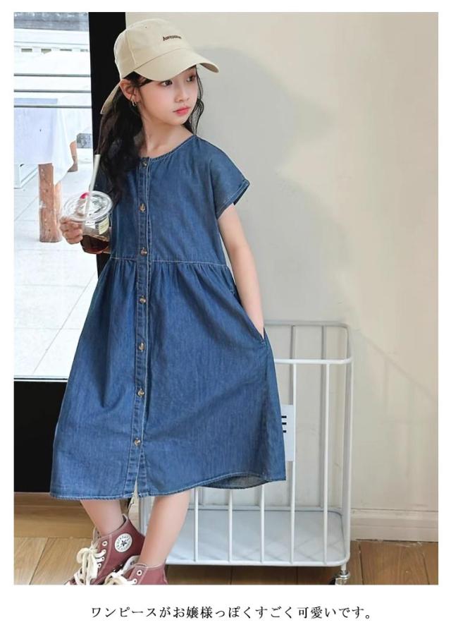 ロングワンピース ワンピース かわいい デニム 半袖 子供 デニム キッズ デニムワンピース 膝下 ワンピース ポケット付き おしゃれ カジュアル 120cm 130cm 140cm 150cm 160cm