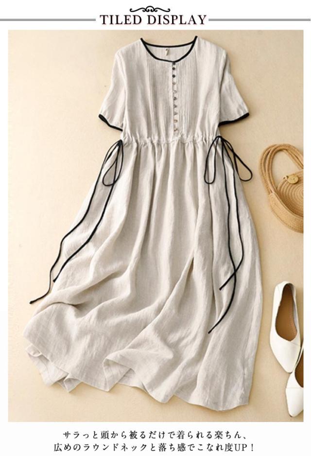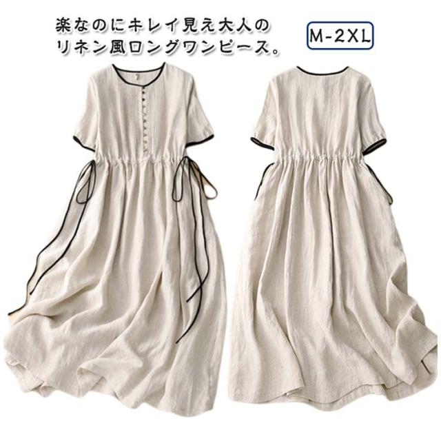 | 大人のためのリラクシースタイル☆リネン風半袖ワンピース。 サラッと軽い薄手の綿麻混素材で、汗ばむ季節も快適!お肌に優しく、ノンストレス◎ ウエストシャーリングでお腹まわりを調整できるので、スタイルよく美ラインと着やせに見せてくれる。 身体のラインを拾わないゆったり身幅。ふんわり広がるAラインスカートで可愛らしさを演出。 ボタンなどがなく、頭からすっぽり被るだけ。着替えに手間取らず、部屋着にもおすすめ。 両サイドにポケットを配置。スマホなどの小物を入れられるから便利。お出かけ先でも快適に。 | |