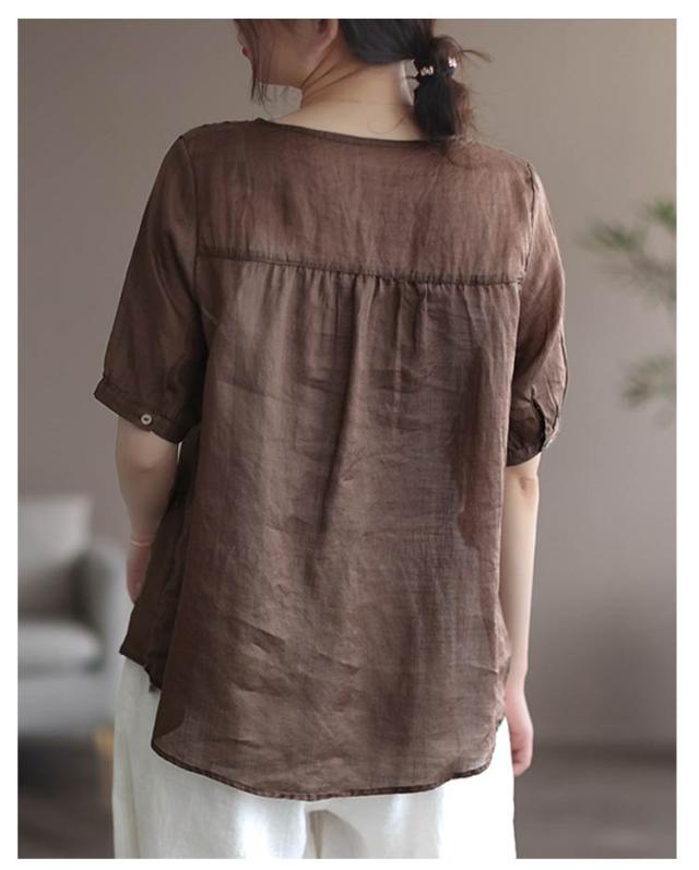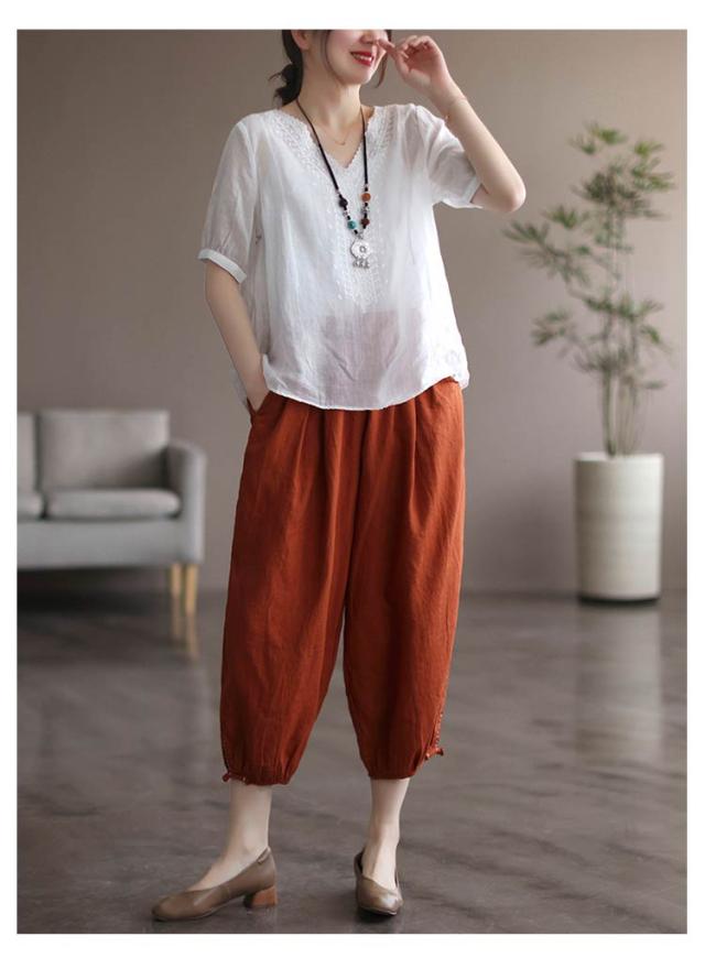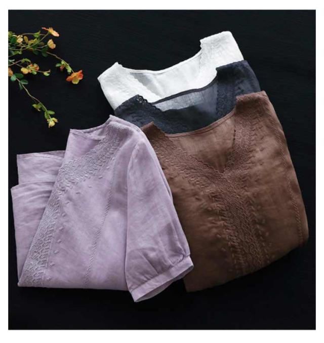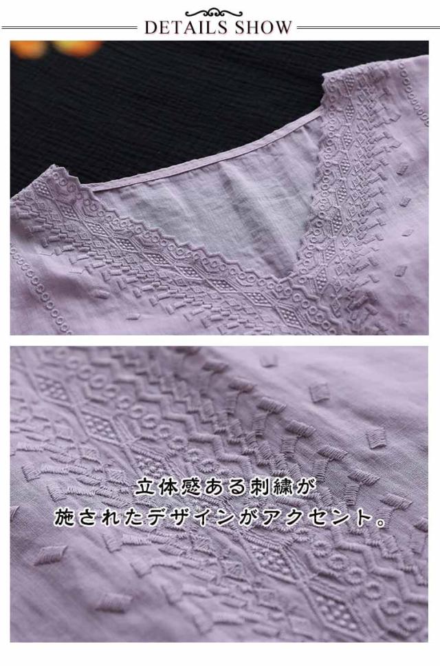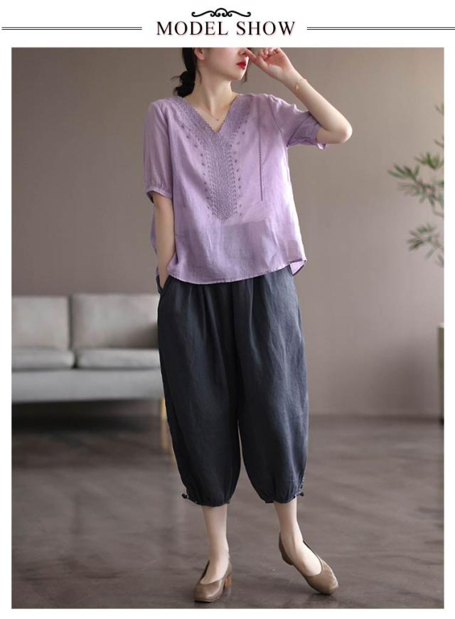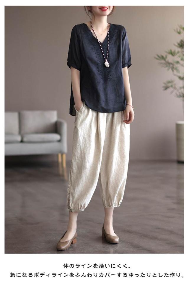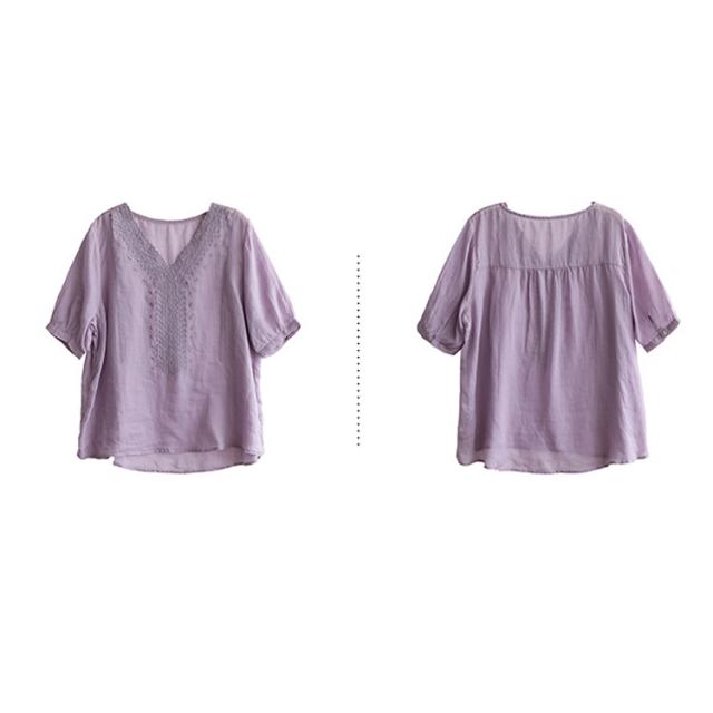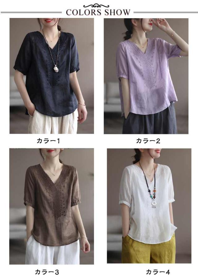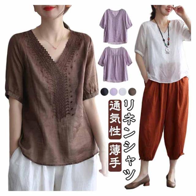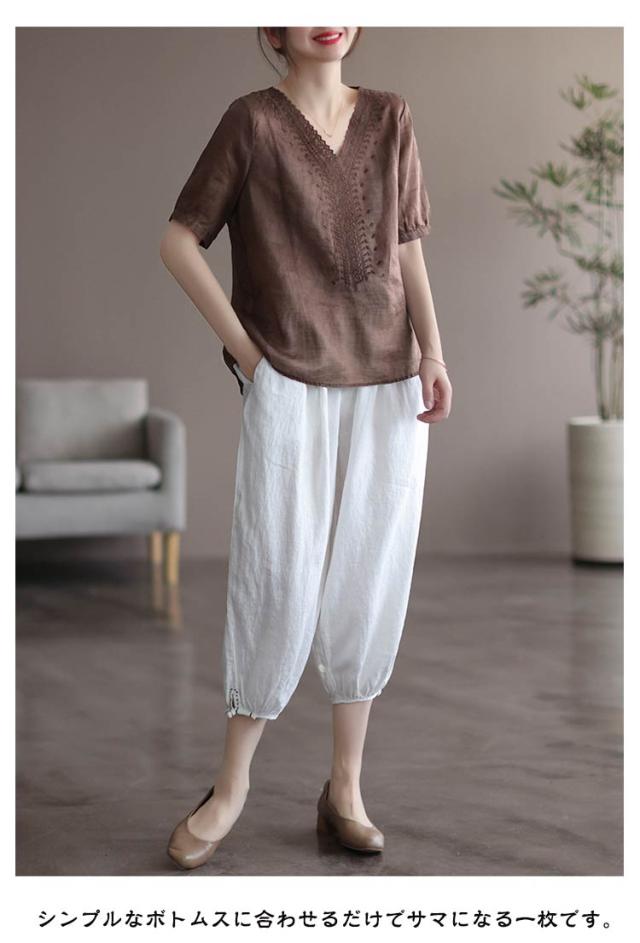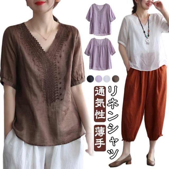 tシャツ 刺繍ブラウス 半袖 レディース リネンシャツ 送料無料 シャツブラウス 綿麻混 チュニックトップス Vネック 春夏 送料無料 花柄刺繍 通気性 シンプル カジュアル ふんわり 体型カバー