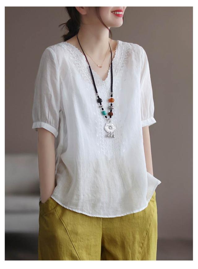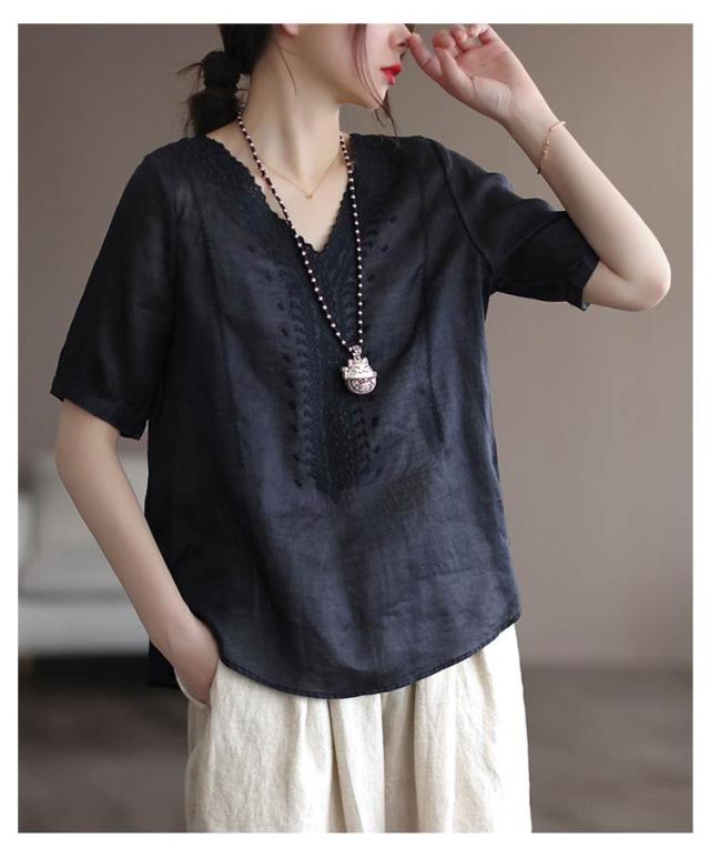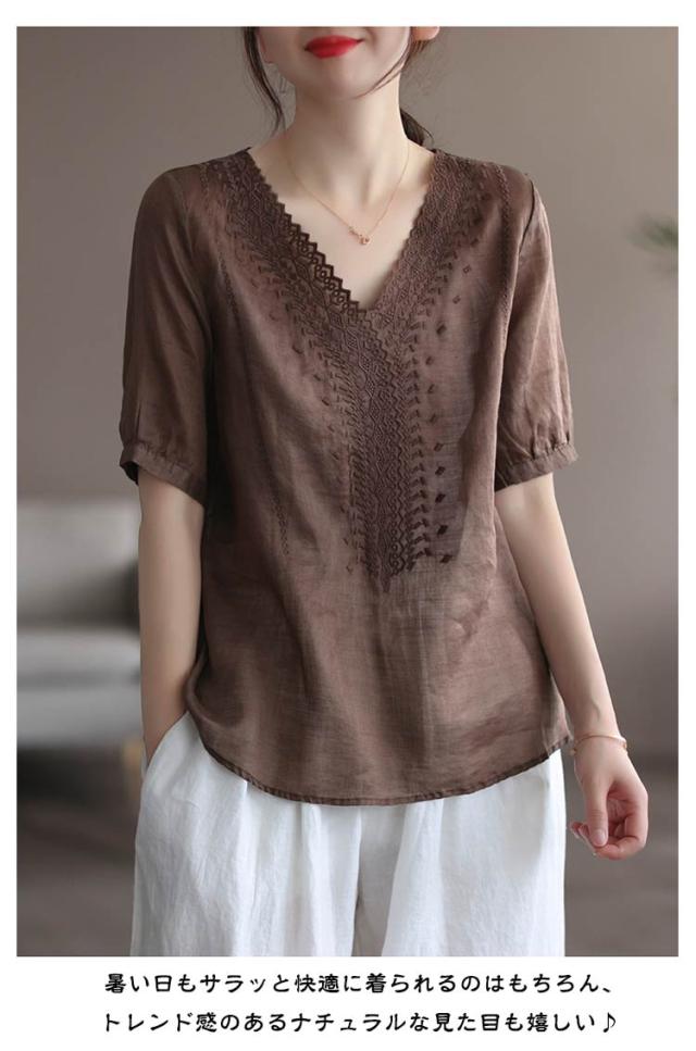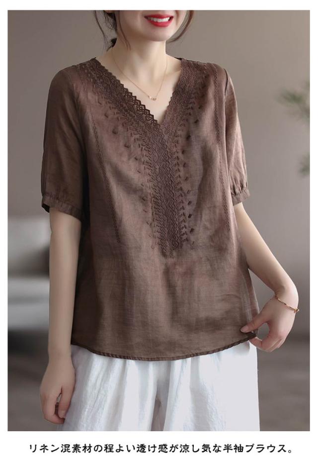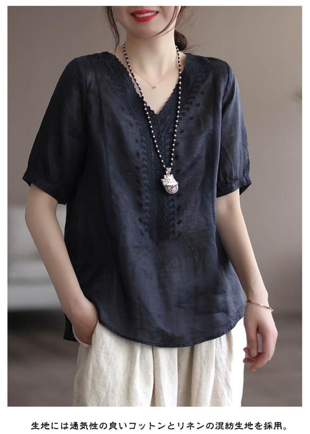リネンシャツ 綿麻混 半袖 通気性 Vネック 刺繍ブラウス シャツブラウス 薄手 チュニックトップス tシャツ 春夏 レディース 花柄刺繍 送料無料 シンプル カジュアル ふんわり 体型カバー