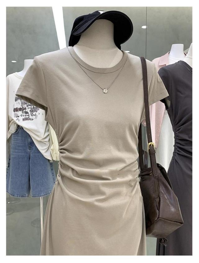 ワンピース ウエストギャザー Tシャツワンピース 半袖 ロング タイト tシャツ レディース 着痩せ タイトワンピース ロングワンピース カジュアル ロング丈 ワンピ サイドギャザー クルーネック Tシャツワンピ 無地 大人 春 夏