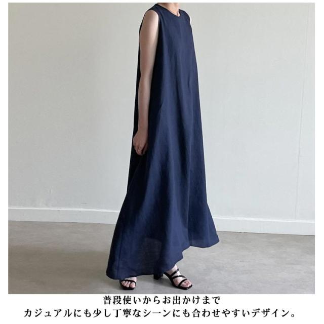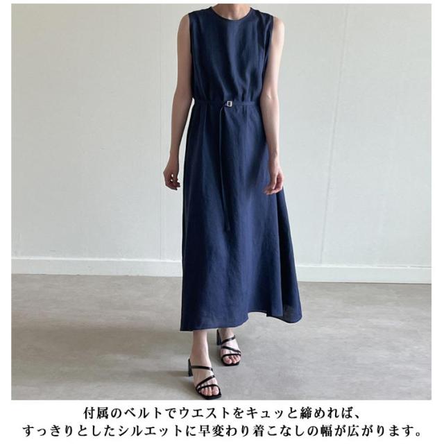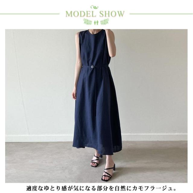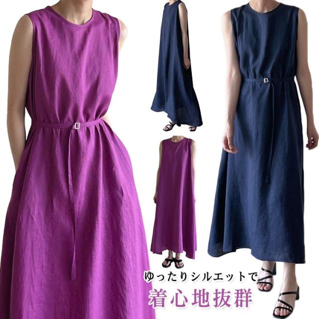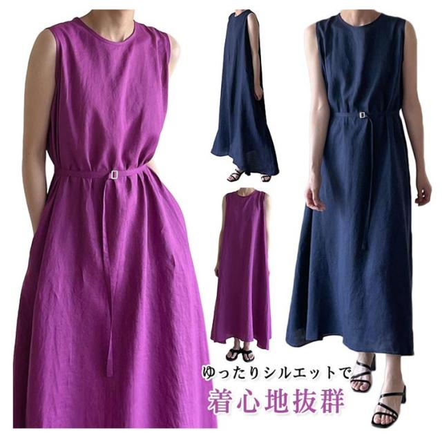 涼しい ワンピース 夏 レディース ワンピ ロング ノースリーブ おしゃれ aライン 大きいサイズ 着痩せ ミモレ丈ワンピース ベルト付き ふんわり コットン オーバーサイズ クルーネック マキシ丈 ロング丈 ワンピース 無地