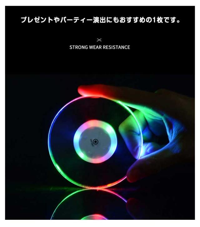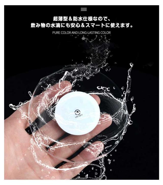 | 置くだけで空間が変わる!光るアクリルコースター。 アクリル製の透明デザインで、コップやワイングラスを置くだけで下からやさしく発光。 超薄型&防水仕様なので、飲み物の水滴にも安心&スマートに使えます。 寝室の間接照明として置物ライトにも活躍。 ボタン電池式で、ケーブルレス&持ち運びもラクラク。 電源ボタンを 秒間押すと、LEDライトが点灯します。 プレゼントやパーティー演出にもおすすめの1枚です。 | |