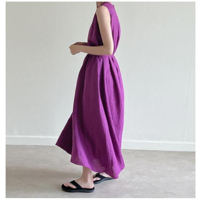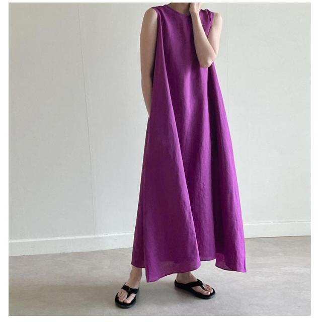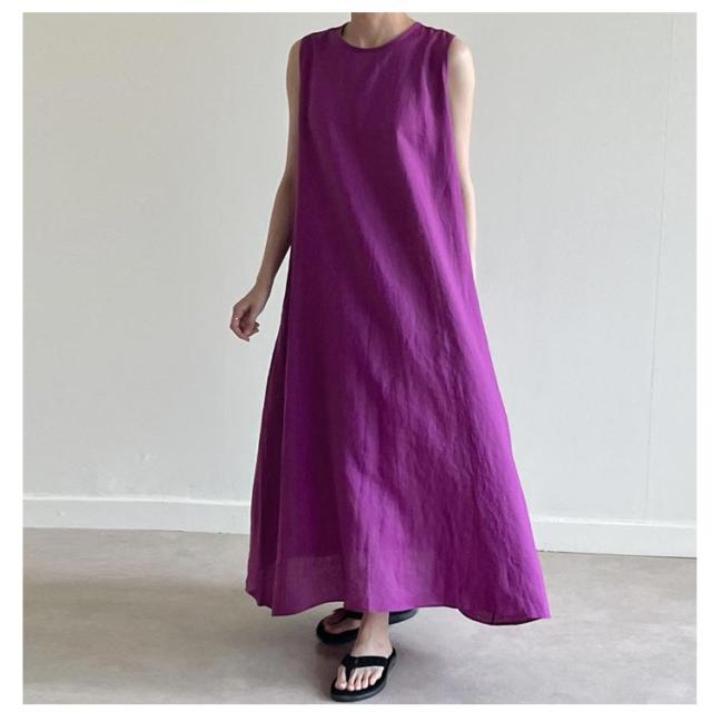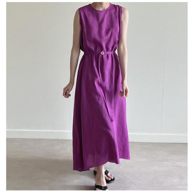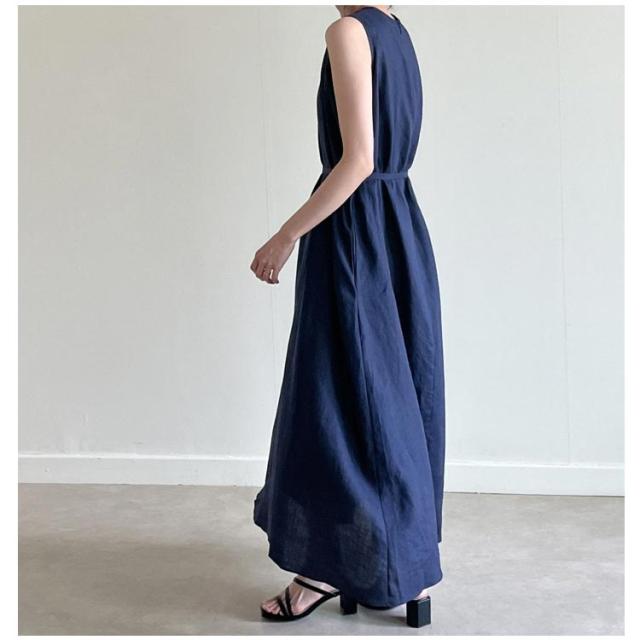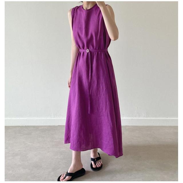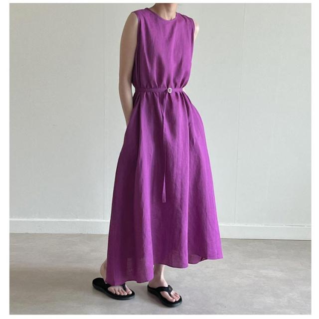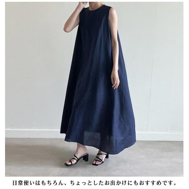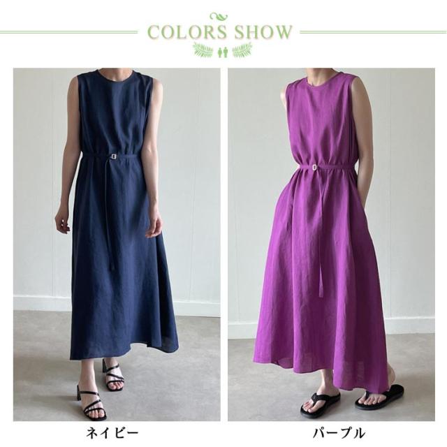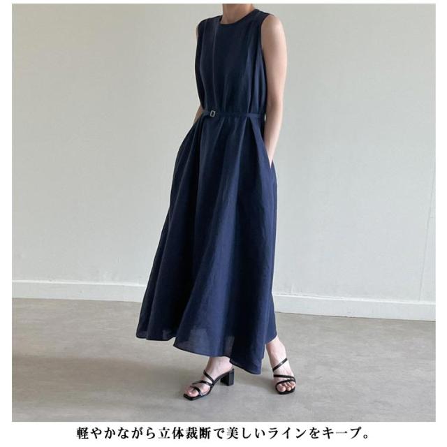 レディース ワンピ ロング ノースリーブ ワンピース 夏 ミモレ丈ワンピース おしゃれ ワンピース シルエット ふんわり 涼しい ベルト付き aライン 大きいサイズ オーバーサイズ クルーネック マキシ丈 ロング丈 コットン 無地