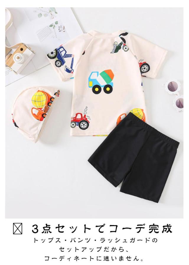 3点セット ベビー 水着 男の子 車柄 半袖Tシャツ 半ズボン 上下セット ラッシュガード セットアップ 幼稚園 小学生 キッズ 子供服 スクール水着 スイムウェア スイミング プール 水遊び プレゼント 誕生日 送料無料
