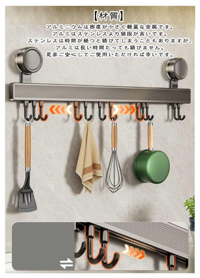 強力 吸盤式 キッチンツールフック 吸盤 キッチンツール フック 壁掛け 粘着吸盤 キッチン収納 キッチン 用 壁掛けフック アルミニウム 防水防錆 穴あけ不要 調理器具 収納 長さ30/40/50/60cm フック6個/8個/10個/12個 タオルハンガー