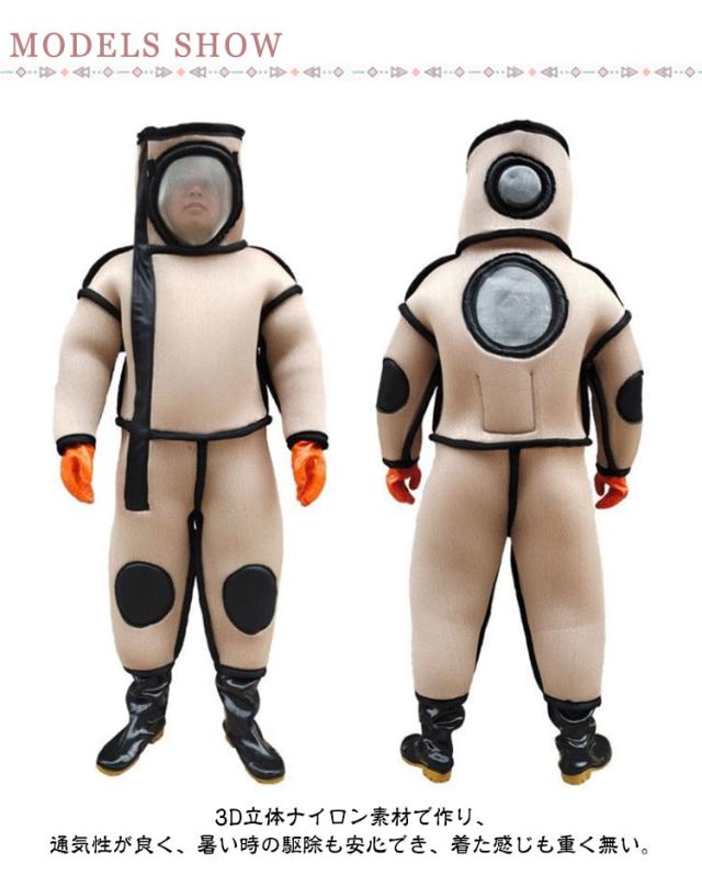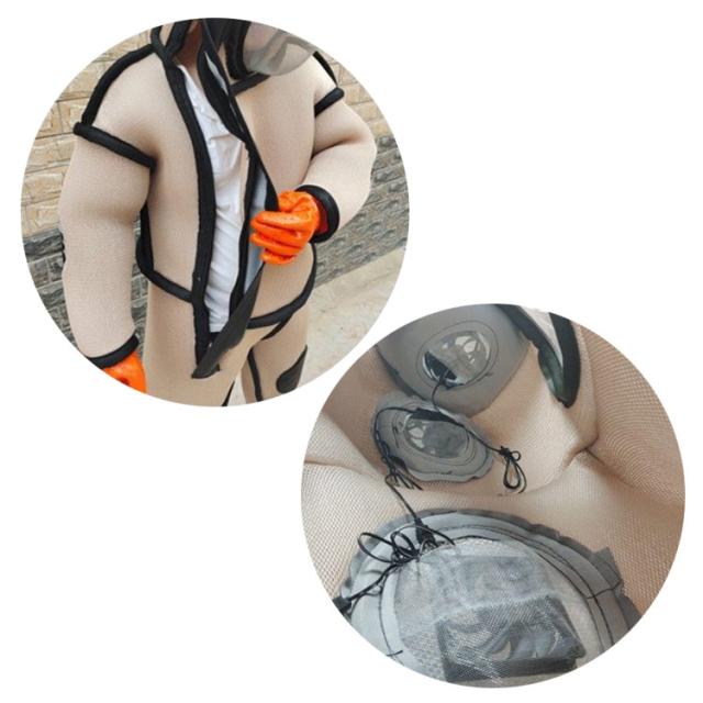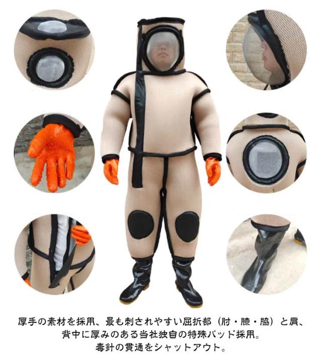 | 軽くて蒸れにくい作りで、超軽量で着心地が良く、自由自在に作業できます。 3D立体ナイロン素材で作り、通気性が良く、暑い時の駆除も安心でき、着た感じも重く無い。 扇風機3つが付いています(バッテリーが付きません。市販のバッテリーがすべて使えます。) 厚手の素材を採用、最も刺されやすい屈折部(肘・膝・脇)と肩、背中に厚みのある当社独自の特殊パッド採用。毒針の貫通をシャットアウト。 養蜂スーツだけではなく、スズメバチ駆除も巣を撤去も、ガーデニングなどの虫よけ、虫さされ対策としてもつかえます。 セット内容:防護服、手袋、収納袋、ゴーグル、巣収納ネット袋。 | |