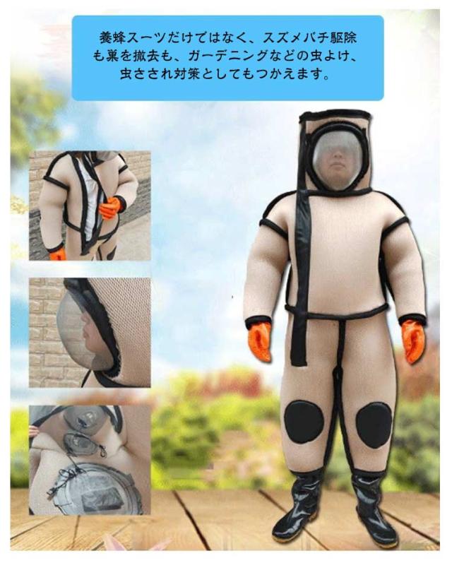 | 軽くて蒸れにくい作りで、超軽量で着心地が良く、自由自在に作業できます。 3D立体ナイロン素材で作り、通気性が良く、暑い時の駆除も安心でき、着た感じも重く無い。 扇風機3つが付いています(バッテリーが付きません。市販のバッテリーがすべて使えます。) 厚手の素材を採用、最も刺されやすい屈折部(肘・膝・脇)と肩、背中に厚みのある当社独自の特殊パッド採用。毒針の貫通をシャットアウト。 養蜂スーツだけではなく、スズメバチ駆除も巣を撤去も、ガーデニングなどの虫よけ、虫さされ対策としてもつかえます。 セット内容:防護服、手袋、収納袋、ゴーグル、巣収納ネット袋。 | |